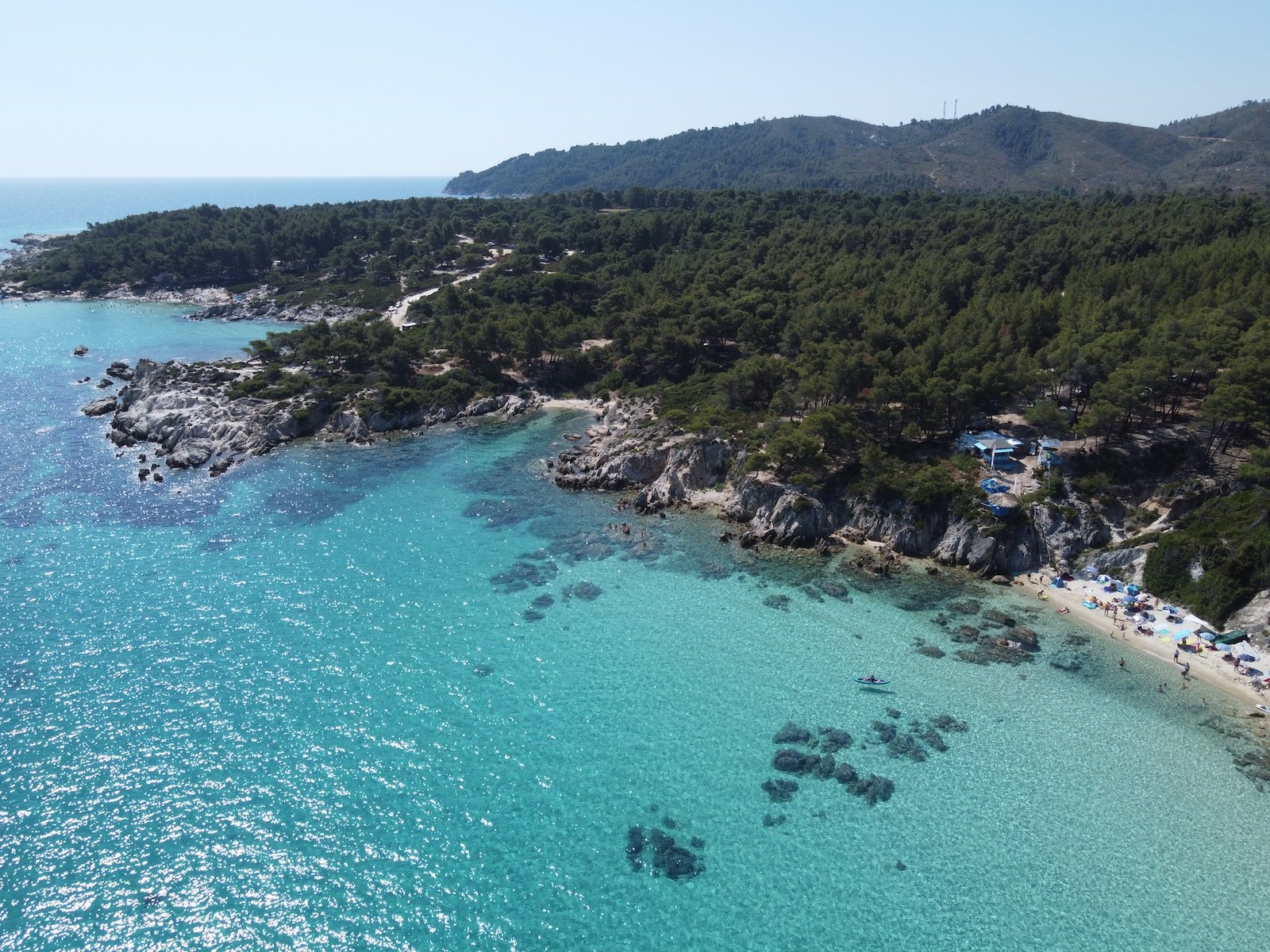 Possidi is less commercialized, so you’ll find just a few tavernas and beach bars nearby. The beach has natural shade from pine trees, and you can rent a sunbed or simply lay out your towel.